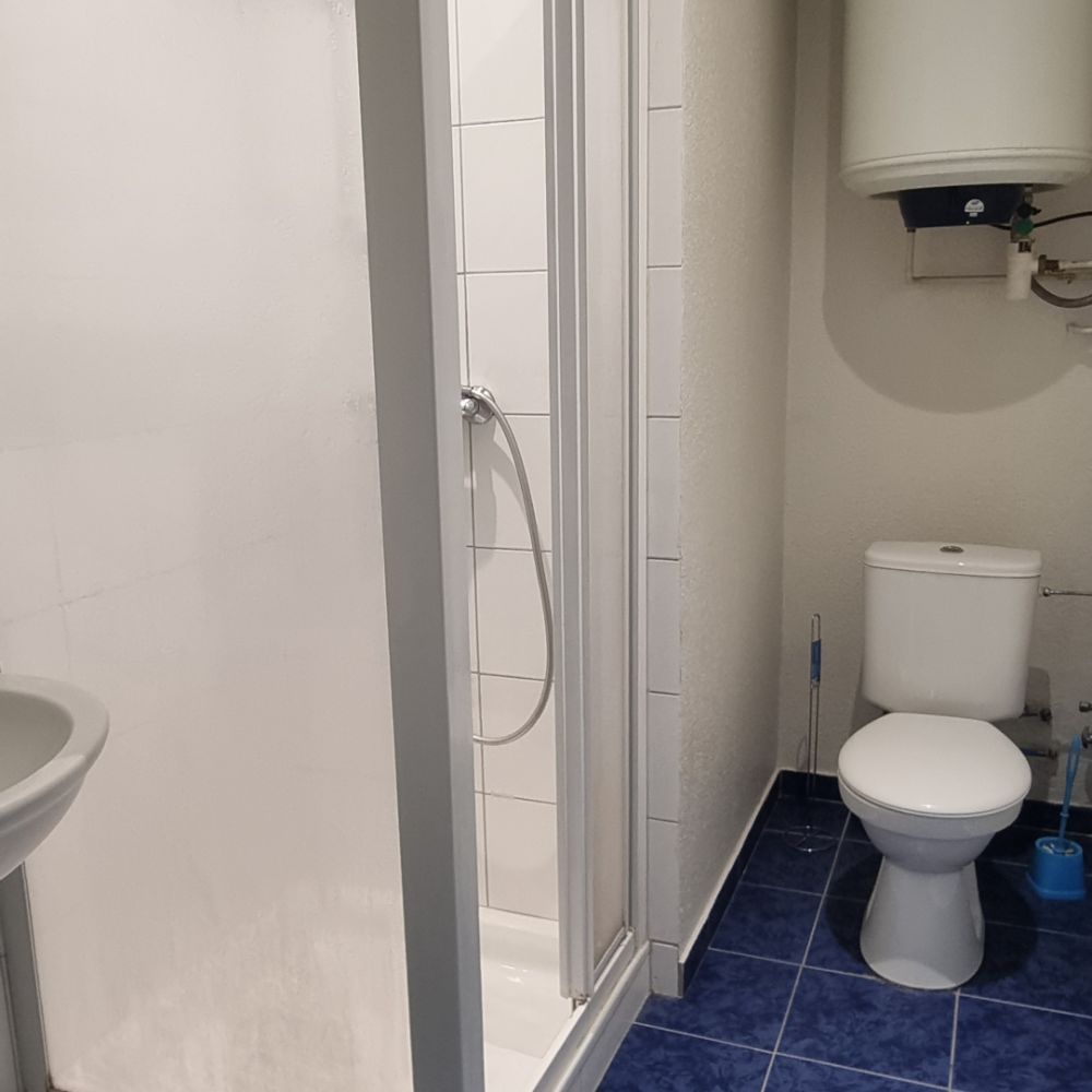 Appartement meublé situé au troisième étage d'un immeuble au centre-ville, comprenant un séjour, une kitchenette équipée et une salle de bains avec douche.