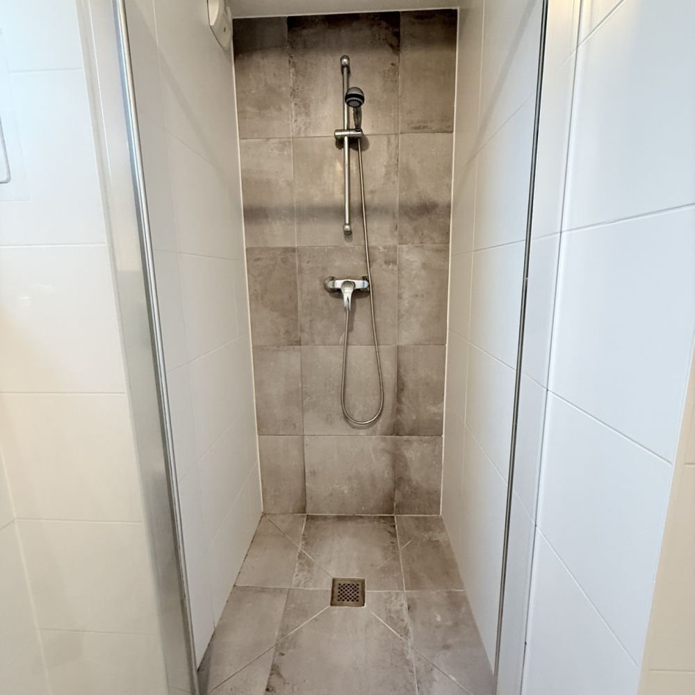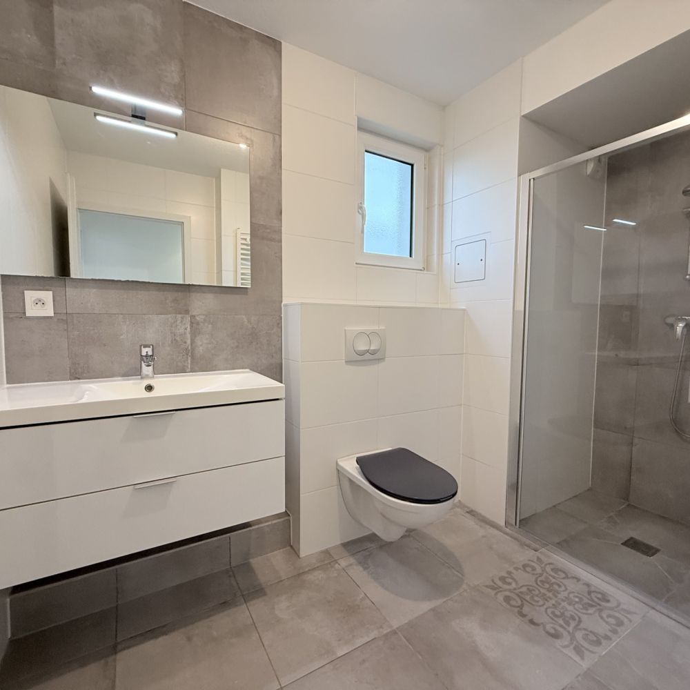 - une salle d'eau-WC avec meuble vasque deux tiroirs, un miroir avec luminaire intégré et une douche italienne